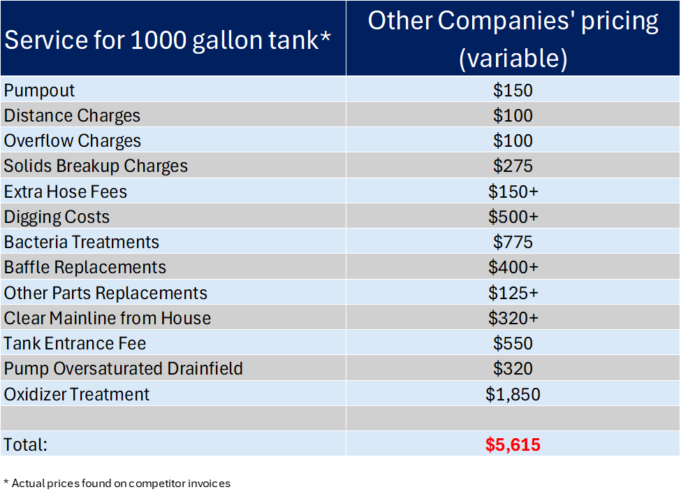 Other companies lure you with low initial prices, then pile on hidden fees – overflow charges, solids breakup charges, extra hose fees, and more. A “$150 pump out” can end up costing thousands.